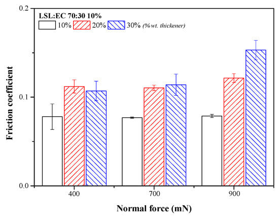 Electrospun lignin nanostructures were dispersed in castor oil at three different concentrations (10, 20 and 30% wt.), and the resulting greases were tested in a steel–steel ball-on-disc nanotribometer. Figure 3 shows the values of the friction coefficient, measured at different normal forces, using greases thickened with the 70:30 LSL:EC nanostructure as the lubricant. In general, it is worth noting a significant increase in the friction coefficient with the nanostructure concentration, which is more evident at high normal force. Moreover, the friction coefficient is not significantly affected by the normal force when using a low thickener concentration or slightly increases with this at higher concentrations, which confirms that the experiments were conducted under mixed lubrication conditions. Furthermore, the friction coefficient values obtained when using these novel greases as lubricants are significantly higher than those obtained with the nanofiber-free base oil (see the values in Table S2). This is a well-known result in the mixed lubrication regime since friction is caused by both the contact between the surface asperities and by the contribution of the lubricant, which, in the case of greases, includes the internal friction of the microstructure.