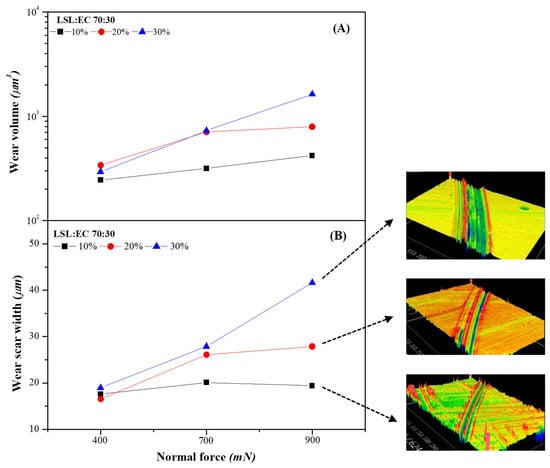 Evolution of the average scar wear volume (A) and wear width (B) with the normal force applied when using lubricating greases thickened with the 70:30 LSL/EC electrospun nanostructure (10% wt. feeding solution) at different concentrations (10%, 20% and 30% wt.).