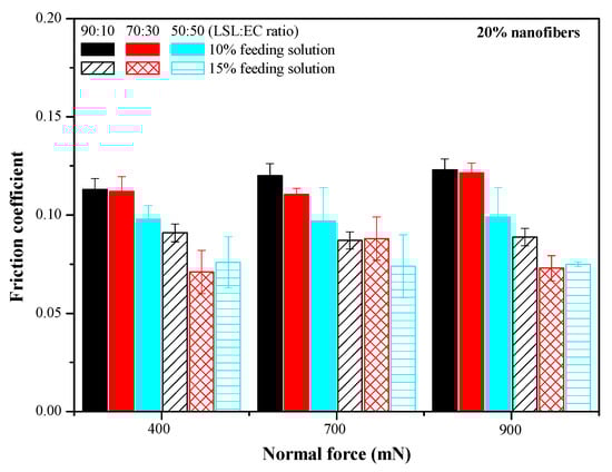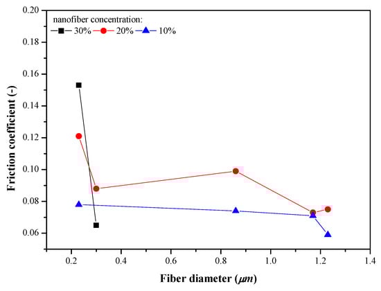 Figure 8 shows the evolution of the friction coefficient with fiber diameter for greases thickened with LSL/EC nanofibrous webs at the three different concentrations studied. As can be seen, nanostructures with larger average fiber diameters tend to reduce friction in any case. As mentioned, it must be taken into account that smaller fiber diameters are also generally associated with the presence of beads in the nanostructure, whereas larger diameters correspond to more homogeneous and fiber-dominated webs. On the contrary, no significant influence of fiber diameter on wear mark dimensions was evinced.
