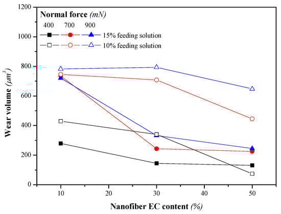 Figure 5 shows the values of the friction coefficient obtained for the three normal forces applied when using bio-based greases thickened with LSL/EC nanostructures, at 20% wt., as a function of the LSL:EC ratio (50:50, 70:30 and 90:10) and the initial feeding solution concentration (10 and 15% wt.). As previously discussed, the morphology of the electrospun nanostructures largely depends on these variables and also strongly affects the friction behavior of the resulting greases, as shown in Figure 5. The friction coefficient generally decreases when increasing both the concentration of the feeding solution to the electrospinning chamber and the EC proportion in the nanostructures. These results suggest that more homogeneous and fiber-dominated mats are able to more steadily release the oil entrapped in the three-dimensional network, facilitating a regular replenishment in the contact, rather than nanostructures with the prevalence of particles or beads inserted in the fibers where the oil is much more readily separated (see oil separation data in Table S3 for selected samples). In general, the contact replenishment capacity of greases thickened with LSL/EC nanostructures differing in the LSL:EC ratio at the same concentration (20% wt.) seems not to be very different, being the morphological characteristics that govern the tribological performance. In fact, the wear scar volume produced in the steel plates was also significantly reduced when using more homogeneous and fiber-dominated electrospun nanofibrous webs as thickeners (see Figure 6), i.e., when increasing the EC proportion, which produced more viscous greases. On the other hand, the achievement of bead-free nanofiber webs, or, at least, a significant reduction in the number of beads, must also minimize the negative contribution of lignin particles in the tribological contact.