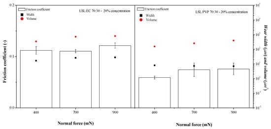 As above mentioned, when replacing EC with PVP as a co-spinning polymer, more homogeneous lignin nanofiber webs with a decreased amount of beads were generally obtained. Figure 7 illustrates the impact of replacing the co-spinning polymer on the friction and wear response of the resulting greases thickened with the electrospun nanostructures. As may be seen, the LSL/PVP nanostructures, under the same electrospinning processing conditions (70:30 LSL:co-spinning polymer ratio, 10% feeding solution) and thickener concentration (20% wt.), provide better lubrication performance to the greases in terms of lower friction coefficient values and reduced dimensions of wear grooves. Again, the lowest friction coefficient values are very similar to those obtained with neat castor oil (Table S2). Particularly, lower friction values were measured using greases containing 10% wt. of LSL/PVP-based nanostructures (see Figure S3 in the Supplementary Materials), where again, increasing the amount of the co-spinning polymer, PVP in this case, proved to be beneficial.