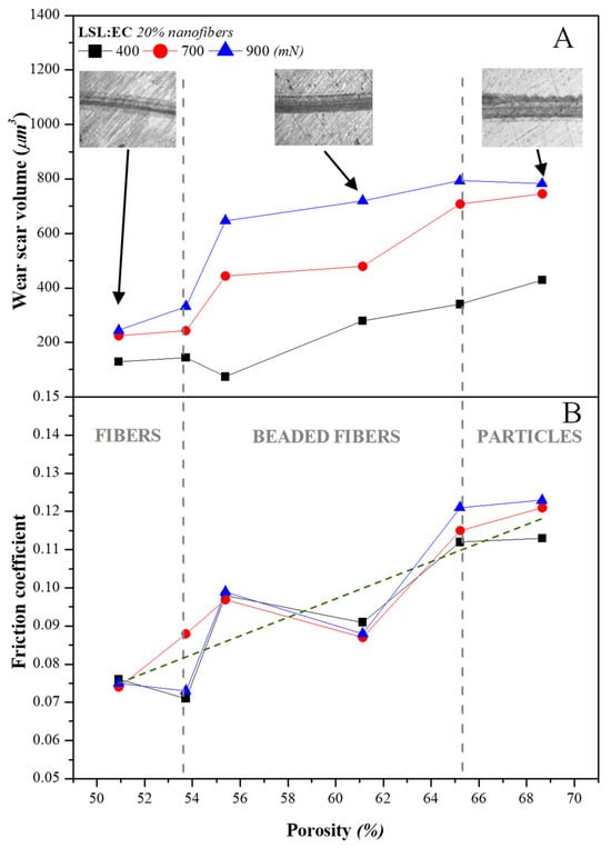Evolution of (A) the wear scar volume and (B) the friction coefficient with the porosity of LSL/EC electrospun nanofibrous webs used to thicken greases (20% nanofiber concentration). The green dotted line in (B) corresponds to a linear fit y = −0.05 + 0.02x (R2 = 0.879), considering all experimental values regardless of the normal load applied.