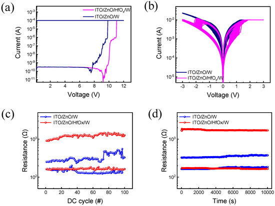 - Jain, N.; Sharma, S.K.; Kumawat, R.; Jain, P.K.; Kumar, D.; Vyas, R. Resistive Switching, Endurance and Retention Properties of ZnO/HfO2 Bilayer Heterostructure Memory Device. Micro Nanostruct. 2022, 169, 207366. [Google Scholar] [CrossRef]
