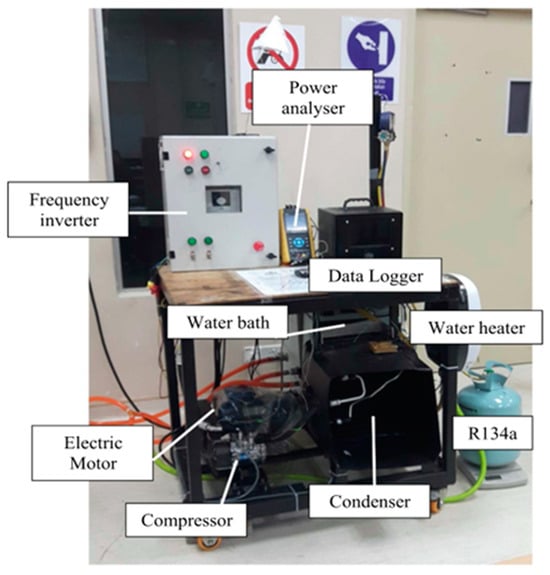Sharif [108] chose a nanofluid as a lubricant to enhance the compressor performance. A SiO2/PAG nanofluid was selected as the nano-lubricant. A vehicle air conditioner test rig was used to measure the heat absorption and coefficient of performance (COP). The test results indicated that the maximum increase in the COP was 24% when using the SiO2/PAG nanofluid. Redhwan [109] prepared Al2O3-SiO2/PAG nanofluids and compared the heat transfer performance and tribology enhancement. Zawawi [110] used an Al2O3-SiO2/PAG nano-lubricant and analyzed its effect on the performance improvement of vehicle air conditioner systems through experimental tests. The test bench is illustrated in Figure 3. It was composed of a power analyzer, frequency inverter, electric motor, water bath, compressor, data logger, water heater, and condenser.