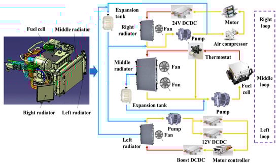 The thermal management system of a fuel cell vehicle (FCV) comprises heat dissipation and air conditioning systems. The heat-dissipation system includes heat-generating (fuel cell stack, DC/DC converter, motor, motor controller, and air compressor) and heat-dissipation (radiator, water pump, fan, and expansion tank) components, as shown in Figure 4.
