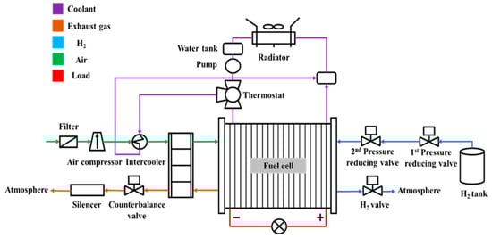 A proton-exchange membrane fuel cell (PEMFC) engine comprises an air supply system, control system, cooling system, fuel cell stack, and fuel supply system. Among these, the fuel cell stack is composed of a single PEMFC, which converts chemical into electrical energy. The cooling system of the PEMFC includes a radiator, fan, pump, intercooler, thermostat, and water tank. The gas temperature at the cathode inlet is adjusted using the coolant temperature and flow rate inside the PEMFC. The coolant can be circulated in a cooling loop, and heat is transferred from the interior of the fuel cell. Figure 5 shows a schematic diagram of a PEMFC engine. The systems and components work together to complete the normal operation of the fuel cell engine.