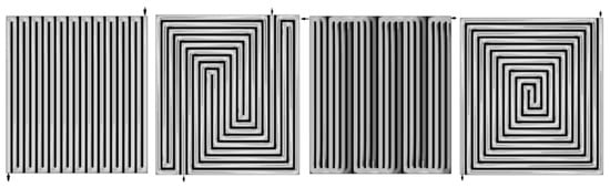 The heat-dissipation performance can be improved by optimizing the internal flow channel structure and adjusting the fuel cell control strategy. The design optimization of fuel cells includes the use of flow channels, bipolar plates, and polymer film cooling channels. The structure of the flow channel includes serpentine, parallel, wave, and spiral flow channels, as shown in Figure 6. The efficiency of fuel cells and different cooling fields was analyzed using a numerical method. It was found that the nearest route to the entrance had a worse fluid distribution than the farthest route. Optimization of the flow channel inside the FCs effectively improved the temperature uniformity and heat exchange rate. Thus, this can enhance a fuel cell’s stability, durability, heat-dissipation capacity, and lifetime [141,142,143].