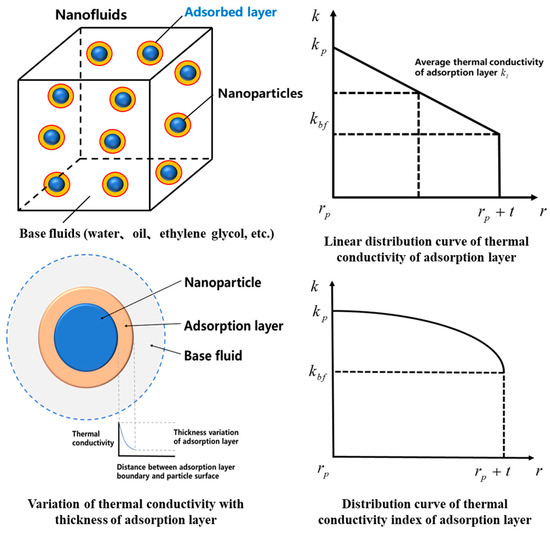 However, predicting nanofluid thermal conductivity accurately using the aforementioned thermal conductivity models is difficult, and many researchers have proposed a theory of adsorption layer thermal conductivity, which refers to the liquid layer formed around solid nanoparticles. The thermal conductivity of the adsorption layer is lower than that of the nanoparticles and higher than that of the base fluid. The thermodynamic properties of the nanoparticles can be transferred to the base liquid, which is reflected in the change in the nanofluid’s thermal conductivity [174]. However, the adsorption layer of a nanofluid is difficult to measure and observe from a microscopic perspective, which is a concept derived from theoretical analyses by researchers. Figure 10 illustrates a schematic of nanoparticles and adsorption layers.