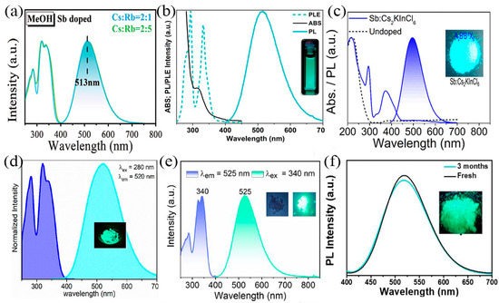 Figure 5. (a) PL and PLE spectra of Sb3+: (Cs1−xRbx)3InCl6. Reprinted with permission from Ref. [47]. Copyright 2021, Wiley. (b) Abs, PL, and PLE spectra of Cs2CdCl4:Sb3+ NPs. Reprinted with permission from Ref. [81]. Copyright 2021, American Chemical Society. (c) Absorption spectra of undoped and Sb-doped Cs2KInCl6, and PL spectrum of 14%Sb:Cs2KInCl6. Reprinted with permission from Ref. [101]. Copyright 2022, American Chemical Society. (d) emission of Sb3+ doped Rb3InCl6. Reprinted with permission from Ref. [85]. Copyright 2020, American Chemical Society. (e) PL spectra of Rb4CdCl6:0.1Sb3+ at RT. Reprinted with permission from Ref. [77]. Copyright 2022, American Chemical Society. (f) PL spectra of Sb:Cs3Cd2Cl7 samples kept in air. Reprinted with permission from Ref. [49]. Copyright 2022, American Chemical Society.
