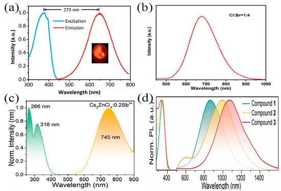 89. Su, B.; Geng, S.; Xiao, Z.; Xia, Z. Highly Distorted Antimony(III) Chloride [Sb2Cl8]2− Dimers for Near-Infrared Luminescence up to 1070 nm. Angew. Chem. Int. Ed. 2022, 61, e202208881. [Google Scholar] [CrossRef]