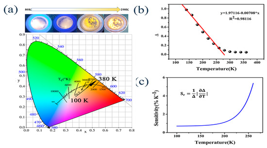 Figure 12. (a) CIE color coordinates in the interval 100 to 380 k; (b) temperature dependence of the emission intensity ratio of 464 to 600 nm; and (c) relative thermal sensitivity in the 100–260 K range of 40%Sb:RbCdCl3. Reprinted with permission from Ref. [79]. Copyright 2022, American Chemical Society.