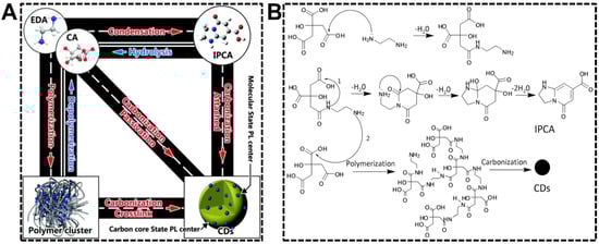 (A) Translational relationship of the products in the upon hydrothermal treatment of citric acid and ethylenediamine. (B) Forming mechanism of the molecule (IPCA), polymer cluster, and CDs. Reproduced with permission [46]. Copyright 2015, The Royal Society of Chemistry.
