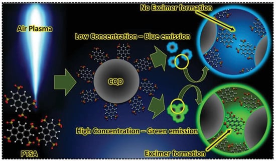 In addition to being carbonized and embedded into the carbon skeleton to directly generate one of the emission bands in dual-emissive CDs, the aromatic residues were also evidenced to be modified on the surface of CDs, leading to inter-particle interaction. Additional emission peaks thus arose due to the electronic coupling. 1,3,6,8-Pyrenetetrasulfonic acid contains a large aromatic plane that can be used for the synthesis of CDs with appealing properties. Being served as the precursor, Jainth et al., synthesized blue/green CDs via the atmospheric pressure air plasma treatment [62]. They found that the emission character of CDs was concentration-dependent, exhibiting purple emission at low CD concentrations but green emission at high CD concentrations. The dual-emission was achievable at a CD concentration of at least 1 g/L. The uncarbonized PTSA molecule on the surface of CDs was considered pivotal for green emission. As shown in Figure 4, the green emission was caused by the formation of PTSA dimers driven by π-π interactions. As a consequence, the green emission was switchable by tuning the concentration of CDs. The inter-particle interaction-induced additional emission bands are more commonly seen in those CDs with solid-state fluorescence or phosphorescence. For instance, Yang’s group synthesized dual-emissive CDs with p-aminosalicylic acid and citric acid [63]. The CDs were featured with blue and red emissions in the solid state. The red fluorescence was ascribed to the supramolecular cross-linking between adjacent particles. The surface groups, determined by the precursor type, were crucial for providing the driving forces (π-π interaction, H-bond) and intermediating the supramolecular cross-linking.