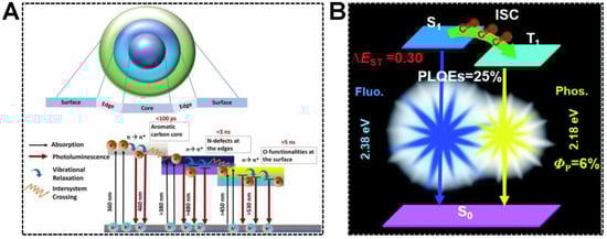 In addition to molecular emission centers, the chemical group, such as carbonyl, is capable of accepting excited electrons in the carbon core. Dual emissions of CDs are thereby achieved in the mechanism of electron transfer, namely, inter-system crossing (ISC). For instance, Chowdhury’s group synthesized dual-emissive CDs using betalain [78]. They concluded that the dual-emissive nature of the CDs was caused by the radiative recombination of excitons in the aromatic carbon core and functional groups attached to the CD surface. As shown in Figure 5A, the mechanism for the emergence of dual-emission bands was proposed as (1) the photoexcited electrons were capable of undergoing synergistic hybridization via π→π* transitions of sp2 carbon core to n→π* transitions of the groups located at the edges, (2) the electrons were then relaxed to the C=O energy levels by non-radiative pathway, (3) the electrons were reactivated via direct recombination or ISC, followed by the vibrational relaxation and the generations of dual-emission peaks. Similar findings were reported by Yuan et al. [79]. In the blue/yellow fluorescence/phosphorescence dual-emissive CDs, the carbonyl groups were evidenced to enhance the ISC process and induce intermolecular electronic coupling, resulting in bright yellow phosphorescence (Figure 5B). Quantitatively, the ISC rate (κisc) was 1.6 × 107, which was comparable to the corresponding radiative decay rate (κF = 6.6 × 107). The efficient ISC process enabled the production of abundant triplet electrons responsible for intense phosphorescence.