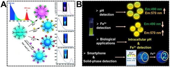 Multiplexed detection requires different signal responsiveness in the presence of multiple targets. For dual-emissive CDs, emission peaks at different wavelengths might show varying optical behaviors, which is of great significance in exploring multiplexed ratiometric sensors. By noticing the various fluorescent responsiveness of glutathione-derived dual-emissive CDs towards Zn(II), Mn(II), and Cu(II), Chai’s group first devised the ratiometric fluorescent sensor for individual or simultaneous detections of these metal ions [97]. As shown in Figure 8A, due to the selective quenching of blue or red emission, the color of the dual-emissive CDs transformed from cyan to pink and cyan to blue upon the additions of Zn(II) and Mn(II)/Cu(II), respectively. A natter blue emission color was generated while the CDs were exposed to the three ions. Relying on its capability to exclude the interferences of other metal ions, the dual-emissive CDs were finally challenged to discriminate Zn(II), Mn(II), and Cu(II) in environmental and biological samples. Nandi et al. reported the detections of pH (hydrogen ion) and Fe(III) using dual-emissive CDs synthesized from 3,4-diaminobenzoic acid and hydrazine hydrate (Figure 8B) [98]. It was found that the relative emission intensity of the bands at 490 nm and 570 nm was evidently dependent on the pH of the medium. At the pH range of 2.0–7.6, the CDs can be served as a robust pH sensor. However, in the presence of trace amounts of Fe(III), the emission at 490 nm quenched drastically. Instead, the 570 nm emission was enhanced. The increased yellow-to-blue emission intensity ratio gave rise to the color change from light green to bright yellow with increasing Fe(III) amounts. It was evidenced that the complexation between CDs and Fe(III) and the accompanied aggregation was the dominant reason for the ratiometric fluorescent response. For the sake of on-site Fe(III) detection, a smartphone-based sensing platform was devised by immobilizing the CDs on filter paper substrates.