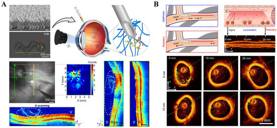 OCT imaging technology. (A) OCT monitored the penetration of micropropellers through the vitreous body of the eye. (From []. © The Authors, some rights reserved; exclusive licensee AAAS. Distributed under a CC BY-NC 4.0 license http://creativecommons.org/licenses/by-nc/4.0/”. Reprinted with permission from AAAS.) (B) Tracking of microrobots’ activity and dynamics based on IVOCT. (From []. © The Authors, some rights reserved; exclusive licensee AAAS. Distributed under a CC BY-NC 4.0 license http://creativecommons.org/licenses/by-nc/4.0/”. Reprinted with permission from AAAS.).