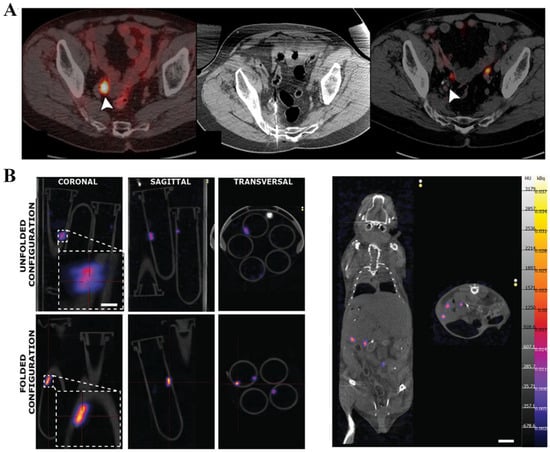 PET and SPECT are both gamma-ray-based imaging techniques, also known as nuclear medicine imaging [,]. Nuclear medicine imaging involves injecting radioactive elements into the body and placing multiple detectors outside the body to receive the radiation signals from inside the body. The use of PET and MRI also enables molecular-guided interventions with a growing number of novel agents, which can improve the localization of certain tumors. For example, PET/CT with prostate-specific membrane antigens can facilitate the treatment of oligometastatic prostate cancer not otherwise seen with conventional imaging (Figure 7A) []. A computer calculates and determines the position of the radioactive target element. PET tracking technology mainly uses radioactive light elements such as 11C, 13N, and 18F, with half-lives ranging from 10–100 min, while SPECT mainly uses radioactive heavy elements such as 99mTc and 123I, with longer half-lives ranging from 6–13 h. Nuclear medicine imaging is strong in anti-interference ability since it only has a radioactive source inside the body, making it particularly suitable for combining with CT for in vivo tracking and imaging. Shi et al. used the PET/CT to monitor the presentative 18F-FDG of mice treated by Bif@PDA-PTX-NPs biohybrids and demonstrated that Bif@PDA-PTX-NPs exhibited a stronger anti-tumor effect and significantly prolonged the survival of tumor-bearing mice [].