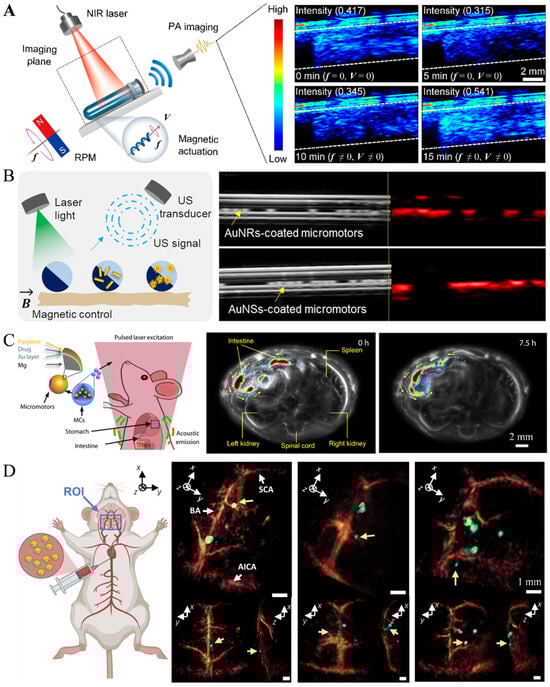Based on dopamine-driven PA imaging, Xie et al. achieved non-invasive in vivo motion tracking of a microswimmer swarm and combined ex vivo fluorescence diagnostics and photothermal therapy for multi-drug resistant Klebsiella pneumoniae infections (Figure 8A []). Aziz et al. study the Janus micromotors with plasmonic nanomaterials to enhance the photothermal conversion efficiency and PA contrast, greatly improving signal in deep tissue due to the presence of PA agents. The motion behavior of the micromotors through a parametric study using closed-loop control with optical feedback was also achieved (Figure 8B) []. In the study of drug delivery by micro/nanorobots in the gastrointestinal system. Wu et al. [] utilized photoacoustic tomography to embed gold nanoparticles on the surface of micro/nanorobots to enhance the reflected signals, enabling the targeted drug delivery trajectory of the micro/nanorobots in the intestine to be tracked (Figure 8C). Wrede et al. combined a high-performance volumetric optoacoustic tomography system with microrobots enhanced via gold conjugation to facilitate the real-time detection of individual circulating microrobots. The high spatiotemporal resolution of the imaging system achieved 3D real-time tracking of microrobots under ex vivo-, in situ-, and in vivo-like conditions (Figure 8D) [].