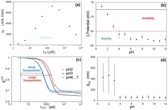 (a) Fluorescence intensity I as a function of . I is obtained from the maximum ( nm) of each spectrum measured by the spectrofluorimeter. (c) Normalized scattering intensity autocorrelation for different pH values. (b,d) The TiO-NP stability in HO mQ as a function of pH for 6 independent samples. (b) -potential measurements. (d) Mean hydrodynamic radius (dots). The bars denote the size dispersion.