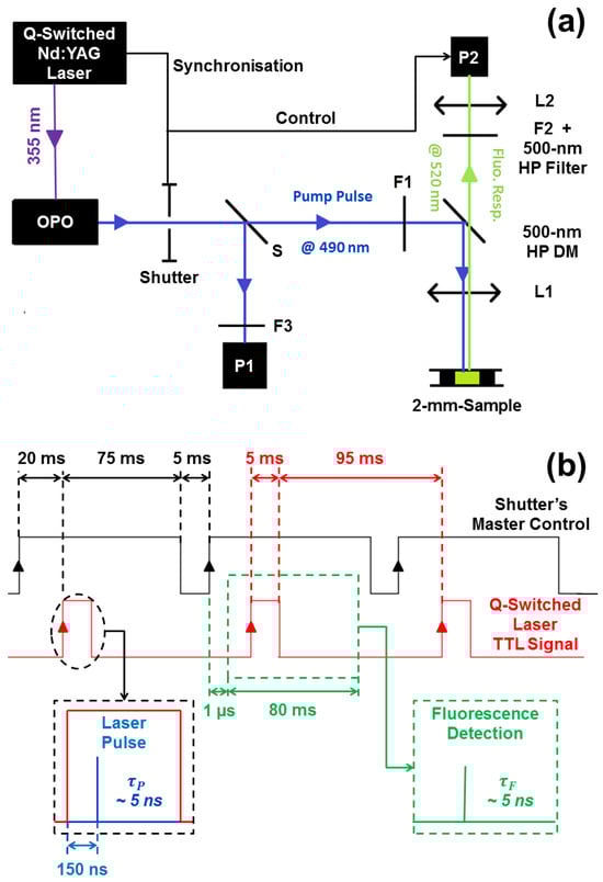 (a) Experimental setup. The pump laser consists of a frequency-tripled ( nm) Nd:YAG pumping a tunable OPO. The resulting nm pulses are split by a beamsplitter S, which captures a small fraction of the energy for monitoring on photodiode P1 (F3 is a set of protective ND filters for P1). The transmitted beam is attenuated by a variable set of ND filters F1 and then deflected by a high-pass ( nm) dichroic mirror DM, and finally focused by lens L1 ( mm) onto the sample placed at the focus of L1. The backscattered fluorescence pulses are collected by L1 (estimated NA = 0.17) and detected by either a spectrometer or a time-resolved detector (both denoted P2). An ND filter F2 can be inserted to attenuate high fluorescence signals to avoid the saturation of P2. The mechanical Shutter determines the length of the pulse train sent to the experiment. (b) Shutter-controlled (black chronogram) acquisition of fluorescence spectra (and fluorescence pulses). Synchronization signal from the laser (red chronogram). Spectrometer control (green) and laser pulse delay control (blue).