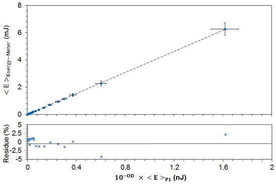 The results are shown in Figure 4, which shows in its upper panel the experimental mean values with standard deviation on both axes, resulting from fluctuations in the energy of the pump pulses. The lower graph shows the deviation (in percent) between the actual measurement and the best linear fit obtained in the upper panel.
