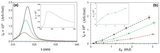 The addition of increasing concentrations of TiO-NPs ( from 1.56 to 6.25 mg/mL) to a 200 M solution of FITC produces a monotonous growth in the collected fluorescence intensity spectra (Figure 5a) at the nominal pulse energy mJ. Plotting the spectral intensity maximum for all values as a function of pump energy (Figure 5b) shows a clear NP-induced amplification. A red shift in the position of the fluorescence maximum (from nm at mg/mL to nm at mg/mL) is evident and can be related to the longer optical path induced by the increased scatterer density. The energy dependence of the fluorescence intensity in the absence of TiO-NPs is visible on a larger scale (inset of Figure 5b). The superlinear fluorescence growth is consistent with amplification by stimulated emission.