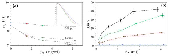 It is interesting to note that the overall shape of the gain curves (Figure 7b) is different from the fluorescence intensity curves of Figure 5b. The latter show superlinear behavior, with a slow start as a function of , whereas shows a fast growth that slows down with increasing pump pulse energy (and perhaps indicates the presence of saturation, at least for the black line). The contrasting behavior reflects the conceptually different nature of the quantities being plotted: while the fluorescence intensity shows the absolute amount of light collected, gain quantifies the benefit derived from the addition of NPs to the fluorescent sample. The experimental results show that the gain is much stronger at lower pump energies than at higher ones, while it grows monotonically with .