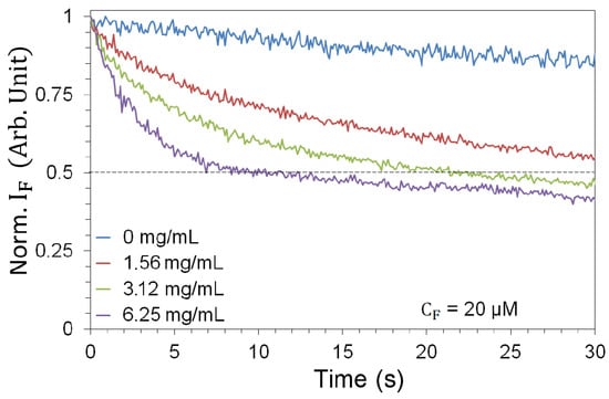 As FITC is subject to photobleaching [57], we need to characterize the fluorescence decay in response to prolonged exposure. This in turn determines the number of pulses to which we can expose the sample before bleaching occurs. Sequences of fluorescence spectra were collected for 1200 pulses (2 min) for each pair of experimental parameters (, ). We observe a sharp fluorescence decrease for all NP concentrations (Figure 3), which complicates the measurement. In order to enable a statistically significant sample—due to fluctuations in the pump pulse energy—while containing the influence of photobleaching, we use a 1 s time window (10 pump pulses) as a reasonable compromise for all pairs of experimental parameters (, ). Measurements are therefore made on a fresh, unused sample that is exposed to only 10 pulses before being replaced.