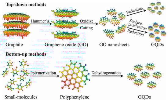 Figure 1. Schematic diagram of top-down and bottom-up GQDs synthesis methods (Reproduced with permission from [79]. Copyright 2012, Royal Society of Chemistry).