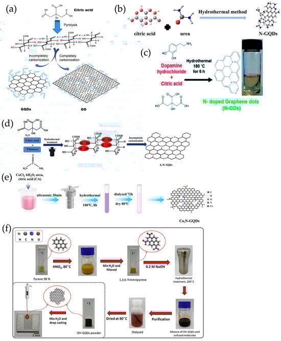 Precursor molecules treated by hydrothermal methods had been demonstrated to be another effective method for producing GQDs, indicating that heteroatoms were easily doped during the synthesis process. Chu et al. [110,111] synthesized GQDs through one-step hydrothermal treatment with citric acid. Using urea [112,113,114,115,116,117] and dopamine hydrochloride [118] as N source, thiourea as S and N source [67,120] respectively, N-doped GQDs (N-GQDs), and S, N co-doped GQDs (S, N-GQDs) were obtained in the presence of CA (Figure 3b–d). In our group, cobalt (Co) and N co-doped GQDs [119] had been successfully prepared by using CA, urea, and CoCl2·6H2O as precursors (Figure 3e). In addition to CA, some small polycyclic aromatic hydrocarbons (PAHs) similar to graphene could also be used as precursors for GQDs [130]. The nitrated pyrene [121] and benzopyrene [122] had been used to synthesize GQDs via hydrothermal method (Figure 3f).