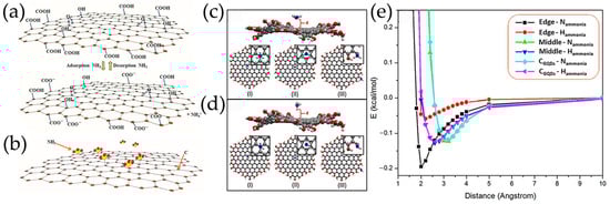 Figure 7. Sensing mechanism of GQDs to NH3, (a) sensor A, (b) sensor B. The interaction model between OH-GQDs and NH3 molecules through (c) N atoms and (d) H atoms of NH3 molecule absorbed (I) in the middle, (II) at the carbon atom and (III) at the edge of OH-GQDs, (e) The relationship between the interaction energy and the adsorption distance of GQDs-NH3 with different adsorption sites and configurations. Reproduced with permission from [68,121]. Copyright 2015, 2020, Elsevier.