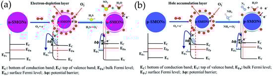 Figure 8. Sensing mechanism of (a) n-type SMONs for reducing H2S gas and (b) p-type SMONs for reducing NH3 gas. Reproduced with permission from [15]. Copyright 2019, Royal Society of Chemistry.
