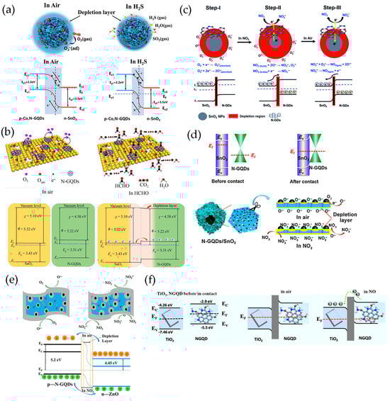 Figure 9. (a) H2S sensing mechanism and energy band structure of Co, N-GQDs/SnO2; (b) HCHO sensing mechanism and energy band structure diagram of N-GQDs/SnO2; (c,d) NO2 sensing mechanism and energy band structure of N-GQDs/SnO2; (e) Sensing mechanism of pure ZnO and N-GQDs; (f) Energy band structure of TiO2/N-GQDs. Reproduced with permission from [100,113,114,116,118]. Copyright 2021, Springer; copyright 2020, Royal Society of Chemistry; copyright 2021, Elsevier; copyright 2020, American Chemical Society.