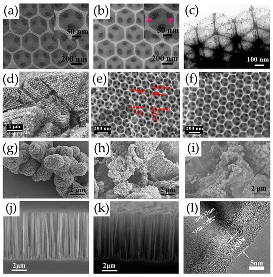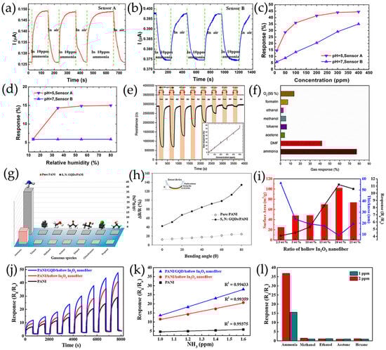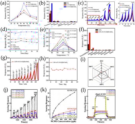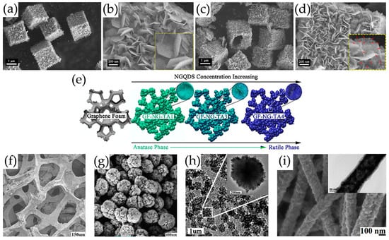 Lv et al. [100] (Figure 13a–d) prepared a novel ultrathin mesoporous nanosheet SnO2 hierarchical hollow cube through a simple sulfidation–oxidation method, which provides beneficial adsorption and diffusion pathways and can quickly adsorb and desorb NO2. Moreover, the rich mesoporous and nanocrystalline boundaries provide more depletion layers for the sensing process, thus increasing the resistance changes after exposure to NO2 gas. The obtained nanoporous TiO2 based on graphene network is subsequently functionalization with N-GQDs, which has a high specific surface area, provides rich reaction sites for gas molecule diffusion, and improves the response capability of gas sensors [99]. As the concentration of N-GQDs increases, the crystalline phase of TiO2 gradually transforms from anatase phase to rutile phase, as shown in Figure 13e–i. The co-contribution of TiO2 nanospheres with 2 wt% N-GQDs results in a low surface free energy, which lays the foundation for the high surface area of the obtained N-GQDs/TiO2/graphene foam sensing materials, showing a high response to 6.1–40 ppb HCHO at 150 °C [99]. In addition, the high proportion of (001) surface in N-GQDs/TiO2/graphene foam plays an important role in improving its gas-sensitive performance and maintaining its stability. The ZnO porous nanostructure modified by S, N-GQDs, and PANI nanocapsules provides a large number of reaction sites and allows gas molecules to diffuse inside and outside the membrane layers. More oxygen molecules are adsorbed on ZnO surface and react with acetone, resulting in significant changes in resistance [120]. The wide specific surface area of hollow In2O3 nanofibers enhances the contact sites with PANI and provides a considerable number of adsorption sites for NH3 gas (Figure 13e) [115].