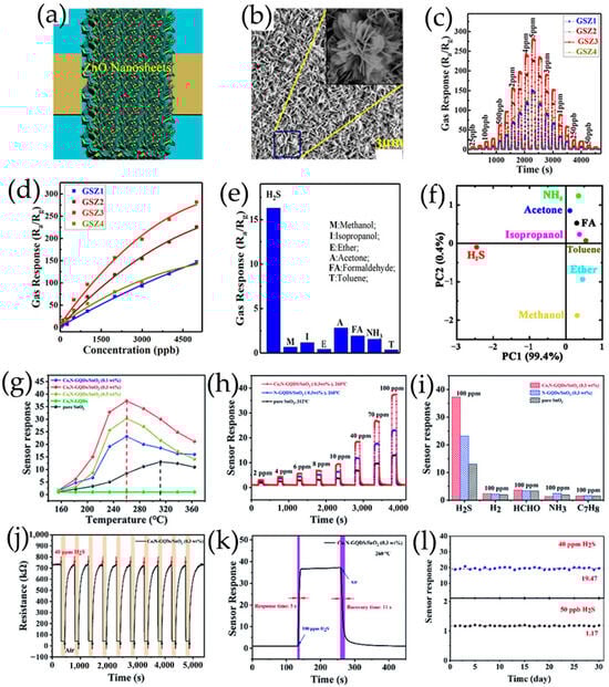 83. Shao, S.; Chen, X.; Chen, Y.; Zhang, L.; Kim, H.W.; Kim, S.S. ZnO nanosheets modified with graphene quantum dots and SnO2 quantum nanoparticles for room-temperature H2S sensing. ACS Appl. Nano Mater. 2020, 3, 5220–5230. [Google Scholar] [CrossRef]