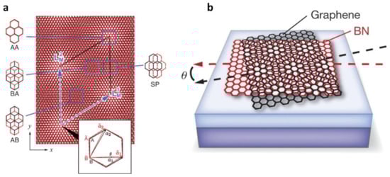Moiré superlattice. (a) Schematic of twisted bilayer graphene []. (b) Schematic of twisted graphene/BN [].