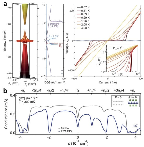 (a) TBG (θ = 1.05°) energy band and the corresponding DOS. Measured Vxx–I curves for devices at different temperatures []. (b) The conductivity of TBG (θ = 1.27°) is modulated by the pressure modulation results. The inset shows the effect of pressure on the interlayer distance [].