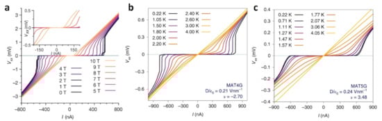 (a) Vxx–I curves for T3G modulated by in-plane magnetic fields []. (b,c) Vxx–I curves for T4G and T5G at different temperatures [].