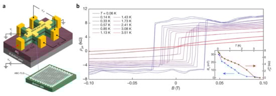 The ABC-TLG/hBN heterostructure offers a highly compelling platform for investigating interrelated topological phenomena [,,,,]. Figure 8a shows the ABC-trilayer graphene/hexagonal boron nitride (ABC-TLG/hBN) moiré superlattice Hall bar device []. In Figure 8b, the graph depicts the Hall resistivity as a function of temperature while subjecting a minor perpendicular magnetic field to a sweeping range of −0.1 T to 0.1 T. Notably, the Hall resistivity exhibits a pronounced anomalous Hall signal accompanied by a robust ferromagnetic hysteresis. The correlated Chern insulator retains its properties even in the absence of a magnetic field, leading to the spontaneous violation of time-reversal symmetry. This state can also give rise to valley-flavor ferromagnetism when filled to one-fourth of its capacity. Notably, ferromagnetic behavior and significant anomalous Hall signals manifest in the Chern insulator state, even when no external magnetic field is applied.