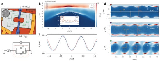 Electrostatic doping is a viable method for adjusting numerous relevant material states of the Moiré superlattice []. Tunable Josephson junctions have been made possible by the existence of a range of in situ tunable states [,,,]. Despite the measurement of phase-coherent phenomena, there has been no demonstration of controlling the phase difference between the superconducting condensates thus far. On the basis of the implementation of gate control, a superconducting quantum interference device (SQUID) has been fabricated in TBG []. By electrostatic manipulation of the proximity current through the junction in SQUID, its properties can be adjusted (Figure 12a) []. At critical currents, oscillations are found, and the superconducting state can be tuned out by electrostatics to suppress the oscillations (Figure 12b). A reduction in the offset 2Ic,2 between the mean values of the positive and negative switching currents results in a change in symmetry from asymmetry to symmetry (Figure 12d). The current phase relationship (CPR) shows that the applied magnetic field and Idc are sinusoidal (Figure 12c).