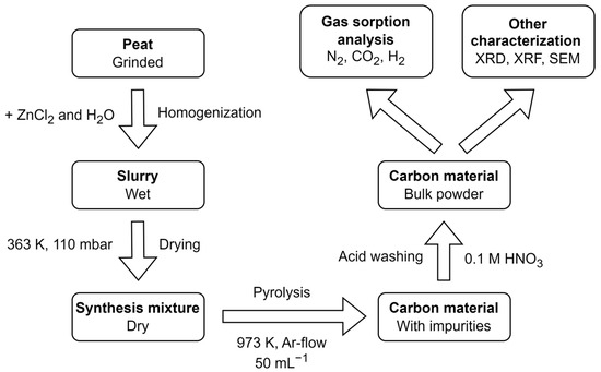 The main process steps for the synthesis and characterization of the peat derived activated carbon are shown in Figure 1. Peat from Möllatsi (Tartu County, Estonia) peat deposit and zinc chloride (ZnCl2, anhydrous, 99.7% purity, Sigma-Aldrich, Saint-Louis, MO, USA) were mixed in pre-determined mass ratios with ultrapure water (Milli-Q, 18.2 MΩ cm @ 298 K, Merck Millipore, Burlington, MA, USA) as the solvent, where around 7 mL of ultrapure water was added per g of combined peat and ZnCl2 mixture. The resulting slurry was stirred until homogenization. Milli-Q water was then evaporated on a hot plate at 360 K and additional drying of the slurry was performed overnight in a Vaciotem TV vacuum oven (J.P Selecta, Barcelona, Spain) at 100 mbar and 360 K. The dried synthesis mixture was transferred in a quartz crucible into a CTF 12/65/550 tube furnace (Carbolite, Derbyshire, UK). Temperature was ramped up 5 K min−1 to 973 K and held for 2 h, under a constant Ar gas flow (5.0, Linde, Dublin, Ireland). Synthesized carbon materials were put into a 250 mL flask with dilute 1 M solution of nitric acid (HNO3, ≥95%, Honeywell, Charlotte, NC, USA) and stirred on a hotplate for 24 h to remove inorganic impurities. Afterwards, the carbon materials were rinsed with Milli-Q water in the flask and strained through a Büchner funnel equipped with filter paper. The resulting carbon material was dried in a vacuum oven (100 mbar, 360 K) overnight, and weighed.