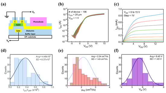 Figure 3f illustrates the statistical distribution of threshold voltage (Vth) for a total of 196 individual a-IGZO TFTs. The average value and standard deviation are estimated to be approximately 6.45 and 1.43 V, respectively. As a result, the fabricated a-IGZO TFT array shows good uniformity and reproducibility. A comparison of the electrical characteristics between the a-IGZO-isolated TFTs and those of the TFT after photodiode integration is depicted in Figure S5. It is confirmed that there is a negligible change in the device parameters for the on/off ratio and the field-effect mobility.
