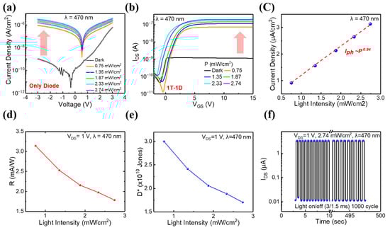 (a) J-V curve of the p-i-n a-Si:H photodiode under dark and light illumination at VDS—3 V (470 nm). (b) Transfer characteristics of a 1T-1D pixel exposed to various light intensities when VDS is 1 V. (c) Photocurrent of p-i-n a-Si:H photodiode at various light intensities (470 nm). (d) Responsivity of p-i-n a-Si:H photodiode at various light intensities (470 nm). (e) Detectivity of p-i-n a-Si:H photodiode at various light intensities (470 nm). (f) Photoresponse under pulsed light illumination at 3 ms with 1000 cycles.