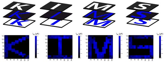 Figure 5 shows the photocurrent mapping using an active pixel image sensor of a 14 × 14 array, showing “K”, “I”, “M”, and “S”. The number of devices corresponding to each character is 76 for K and I, 116 for M, and 98 for S. Except for the parts corresponding to the characters in the four characters, the shadow mask was covered and measured at VDS = 1 V and VGS = 15 V. The part receiving external light illumination is expressed as Iph. Accordingly, these results show the excellent operational performance of an integrated image sensor that combines a-IGZO TFT and p-i-n a-Si:H photodiodes, demonstrating remarkable electrical and optical uniformity [45].