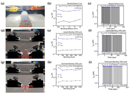 (a) When a bending radius of 20 mm was applied and measured, an image was obtained. (b) The difference in current between the dark and photo states of the 1T-1D integration transfer curve, with a bending radius of 5 mm applied (Vd = 1 V, Vg = 15 V). (c) Photoresponse under pulsed light illumination at 3 ms with 1000 cycles for a bending radius of 5 mm. (d) The image in the flat-upward bending radius in a 5 mm state. (e) The difference in current between the dark and photo states of the 1T-1D integration transfer curve after performing 1000 cycles of flat-upward bending with a radius of 5 mm. (f) Photoresponse under pulsed light illumination at 3 ms with 1000 cycles for a flat-upward bending radius of 5 mm after 1000 cycles. (g) The image is in a flat-downward bending radius 5 mm state. (h) The difference in current between the dark and photo states of the 1T-1D integration transfer curve after performing 1000 cycles of flat-downward bending with a radius of 5 mm. (i) Photoresponse under pulsed light illumination at 3 ms with 1000 cycles for a flat-downward bending radius of 5 mm after 1000 cycles.