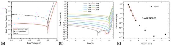 The simulations were performed by the commercial software Crosslight APSYS, Version 2021 [23]. The radiative recombination, Auger recombination, Shockley–Read–Hall (SRH) recombination, band-to-band tunneling, and trap-assisted tunneling processes were considered to calculate the dark current of the devices. Figure 1a shows the layer structure of the In0.53Ga0.47As detector, lattice-matched grown on an InP(100) substrate. The simulations studied four devices with absorber doping concentrations of 1 × 1015, 2 × 1015, 5 × 1015, and 1 × 1016 cm−3, respectively. A wafer with the exact structure as that in Figure 1a was grown through the metalorganic chemical vapor deposition (MOCVD) technique, except that the absorber was unintentionally doped, to target a low doping concentration below 2 × 1015 cm−3. The lattice-matched In0.53Ga0.47As layers were grown on the n+-type InP(100) substrate. An n-type 250 nm In0.53Ga0.47As layer, doped to 2 × 1018 cm−3, was deposited as an etch stop, followed by a 2.5 μm In0.53Ga0.47As absorber layer sandwiched by heavily doped InP contact layers. The top p+-type InP contact layer is succeeded by a p++-type InGaAs layer for improved Ohmic contact.