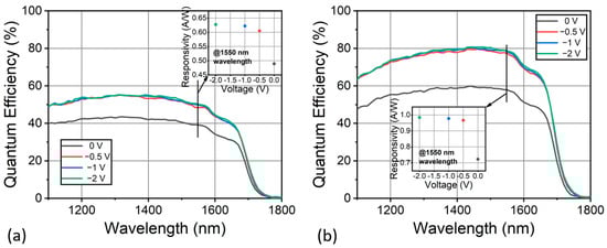 (a) Quantum efficiency of the fabricated InGaAs photodiode without AR coating under different bias voltages at 300 K. (b) Quantum efficiency of the fabricated InGaAs photodiode with AR coating under different bias voltages at 300 K. The insets show the measured photoresponsivity at 1500 nm as a function of bias voltages.