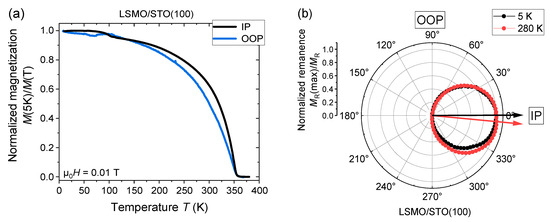 In order to elaborate on the magnetic properties of [(LMCO)n/(LSMO)n]m/STO(100) SLs, we first introduce single films of LSMO/STO(100) and LMCO/STO(100). The optimally doped perovskite manganite La0.7Sr0.3MnO3 (LSMO) is a well-known soft FM metal with an in-plane (IP) magnetic easy axis and magnetotransport properties governed by the DE interaction [47]. An almost 100% spin polarization at the Fermi level in the ground state [48] makes LSMO promising for spintronic applications. In Figure 2a, field-cooled IP and out-of-plane (OOP) magnetization measurements of a MAD-grown LSMO/STO(100) thin film with a thickness of d = 25 nm are shown, exhibiting a Curie temperature of TC,LSMO = 355 K. Together with the rotator measurements of the remanent magnetization (Figure 2b) and measurements of magnetic hysteresis (Figure S4, SM), we conclude a soft FM behavior with an IP easy axis and a small coercive field µ0Hc(5 K) ≈ 3 mT in agreement with previous reports on LSMO/STO(100) thin films [49].