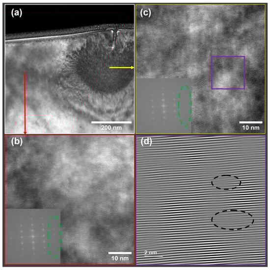 To identify the nature of the semicircle-like region in the He-FIB-milled GaN, HRTEM images from both the semicircle-like and unaffected regions were obtained. Figure 4 shows a bright-field TEM image of the sample after 50 s of He ion milling and HRTEM images collected from different regions. The crystallinity of the unaffected crystalline region was confirmed by the HRTEM images with clear lattice contrast and sharp FFT peaks (Figure 4b). However, in the semicircle-like region (Figure 4c), the lattice contrast was less pronounced, and some FFT spots representing lattice planes with smaller interatomic spacings were missing (marked by the green oval dashed circle), indicating that the lattice disorder might be created by the helium ion beam. Stacking faults and dislocation loops marked by the dark dashed oval circles in Figure 4d further suggested the existence of interstitial defects. The macroscopic crystal expansion around the rupture region in Figure 4a could be ascribed to such interstitial-induced stress [35].