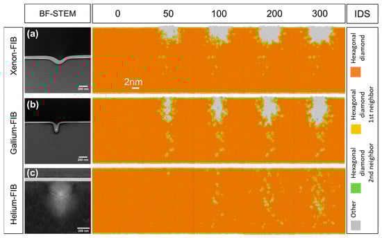 MD simulations were performed to investigate the effect of the ion beam on single-crystal GaN during the FIB process. The probe sizes of the incident particles (Xe and Ga) during simulations were set to be 3 nm and 1 nm to match the ratio of the probe sizes for the Xe-FIB (62 nm) and Ga-FIB (21 nm) during the experiments. The simulations for the He-FIB were performed using typical probe sizes of 0.5 and 1 nm for optimal conditions in the helium ion microscope. The Identify Diamond Structure (IDS) analysis was applied since it can be used to classify the local disorders in cubic and hexagonal diamond structures [36]. Figure 5a–c demonstrates the evolution of the IDS defects under bombardments with different numbers of the incident Xe (3 nm probe), Ga (1 nm probe), and He (0.5 nm probe) particles, respectively. The distribution of the IDS defects is in accordance with the experimental results, elucidating the observed differences in the aspect ratios of the trenches. In addition, in the simulation of the He particles bombarding the GaN surface, a small IDS defect appeared at 1.5 nm from the upper surface of the sample after the bombardment of 50 particles. As the number of particles increases, more IDS defects occur progressively, albeit still very localized, indicating that the milling is considerably less efficient with He ion bombardment compared to that with the Ga and Xe ions, which is in line with the experimental observations.